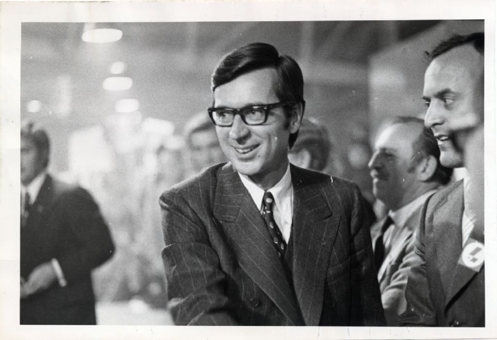 Robert Bourassa et des partisans, [Janvier 1970], Archives nationales à Québec, Fonds L'Action catholique, (03Q,P428,S3,SS1,D12,P2), Photographe non identifié.