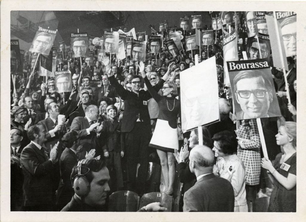 Robert Bourassa, son épouse et les partisans, [Janvier 1970], Archives nationales à Québec, Fonds L'Action catholique, (03Q,P428,S3,SS1,D12,P4), Photographe non identifié.
