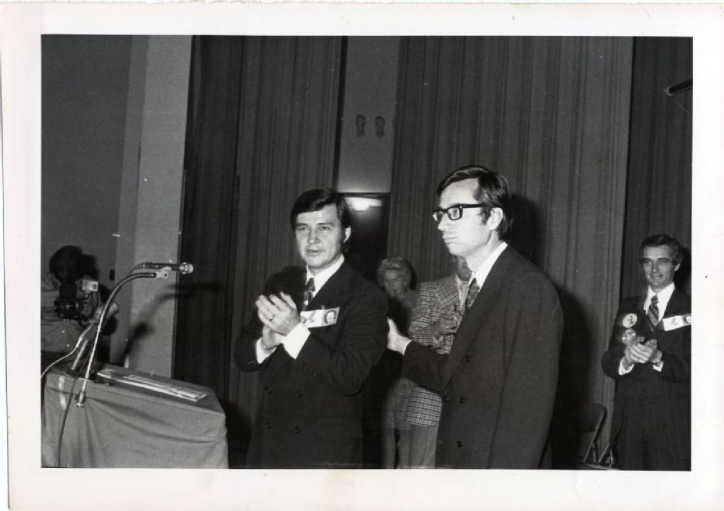 Robert Bourassa s'approchant de la tribune pour son discours, [Janvier 1970], Archives nationales à Québec, Fonds L'Action catholique, (03Q,P428,S3,SS1,D12,P5), Photographe non identifié.