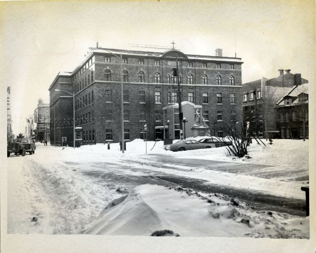 Couvent Saint-Roch en hiver, [Vers 1965], Archives nationales à Québec, Fonds L'Action catholique, (03Q,P428,S3,SS1,D13,P10-2), Photographe non identifié.