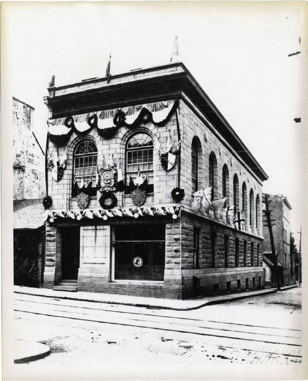 Vue éloignée de la façade et du profil droit sur la rue Sainte-Angèle, les décorations sur l'édifice sont pour la visite du Prince de Galles. Rue Saint-Jean, quartier Vieux-Québec
