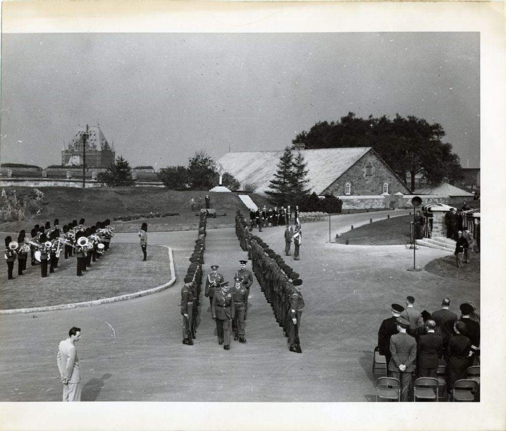 Cérémonie de revue de la garde, [Vers 1955], Archives nationales à Québec, Fonds L'Action catholique, (03Q,P428,S3,SS1,D13,P14-59), Photographe non identifié.