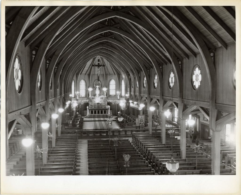 Vue intérieure de l'église Notre-Dame-de-Grâce, [Vers 1950], Archives nationales à Québec, Fonds L'Action catholique, (03Q,P428,S3,SS1,D14,P12-13), Turcotte & Gousse Enr'g.