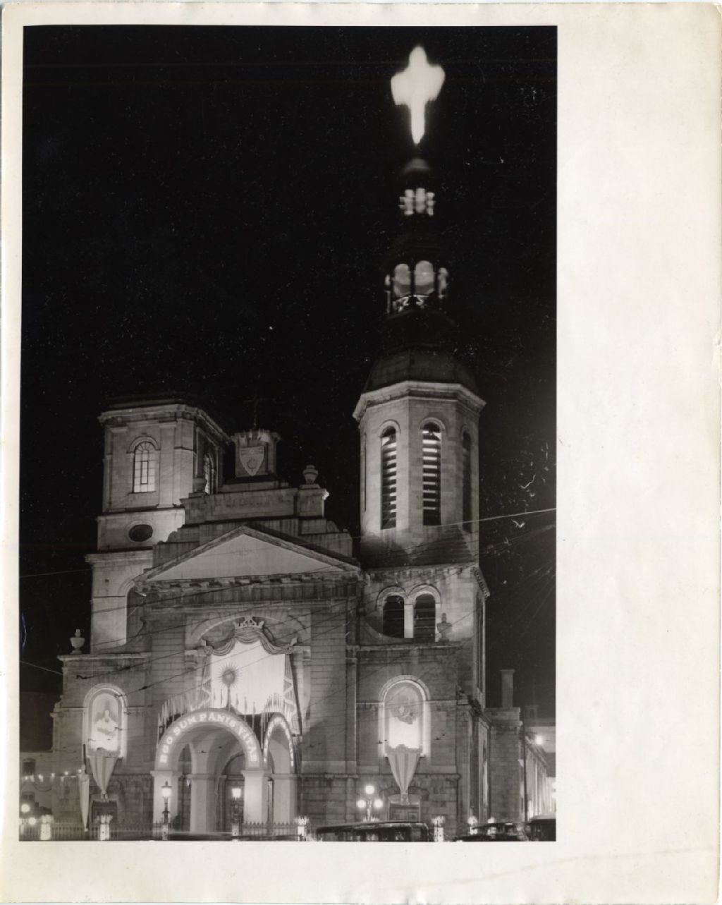 Basilique-cathédrale Notre-Dame-de-Québec éclairée et décorée pour une manifestation religieuse, [Vers 1960], Archives nationales à Québec, Fonds L'Action catholique, (03Q,P428,S3,SS1,D14,P14-8), Photographe non identifié.