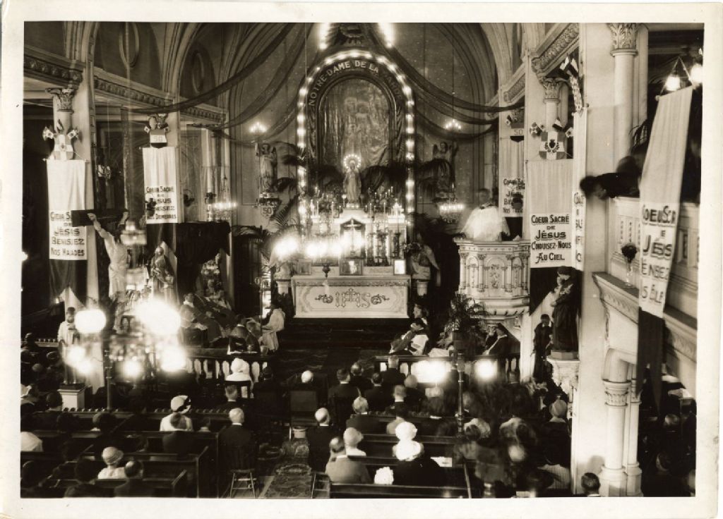 Vue intérieure de l'église Notre-Dame-de-la-Garde lors d'une cérémonie religieuse, [Vers 1925], Archives nationales à Québec, Fonds L'Action catholique, (03Q,P428,S3,SS1,D14,P15-3), Photographe non identifié.