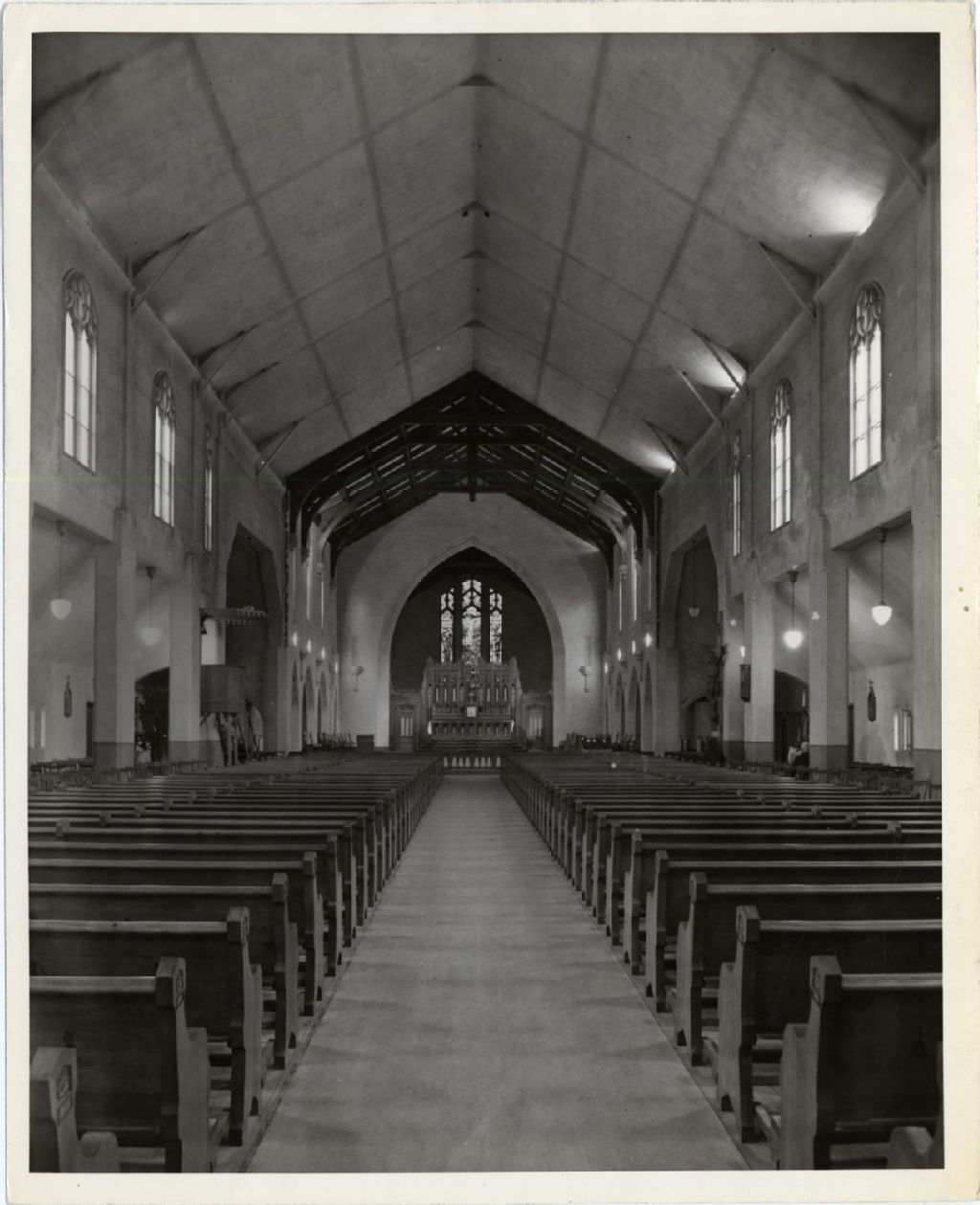Vue intérieure de l'église Saint-Dominique, [Vers 1945], Archives nationales à Québec, Fonds L'Action catholique, (03Q,P428,S3,SS1,D14,P7-3), Photographe non identifié.