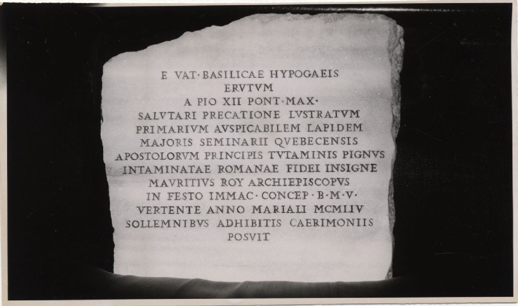 Pierre provenant de la crypte de la basilique Vaticane et sanctifié par la bénédiction de Pie XII, décembre 1954, Archives nationales à Québec, Fonds L'Action catholique, (03Q,P428,S3,SS1,D16,P107), Photographe non identifié.