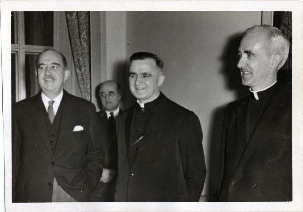 Hughes Lapointe, cardinal Maurice Roy et Mgr Louis-Albert Vachon lord d'une fête patronale de l'université Laval, décembre 1966, Archives nationales à Québec, Fonds L'Action catholique, (03Q,P428,S3,SS1,D16,P117), Photographe non identifié.