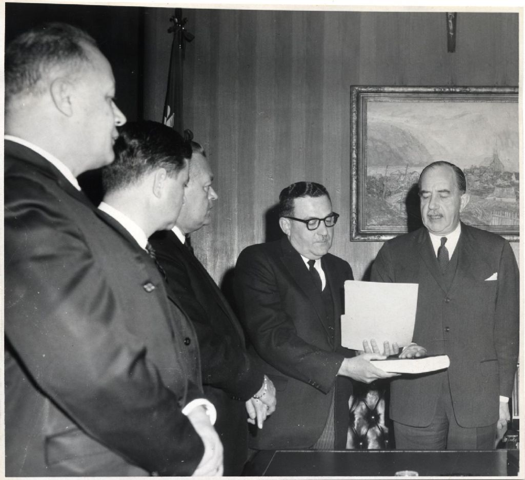 Vue rapprochée prise lors de l'évènement, de g. à d. Bona Arsenault, Jacques Prémont, Jean Lesage, le juge Tremblay et le nouveau lieutenant-gouverneur Hugues Lapointe
