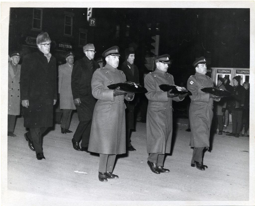 Des officier portent les décorations du général Georges P. Vanier lors de ses funérailles, mars 1967, Archives nationales à Québec, Fonds L'Action catholique, (03Q,P428,S3,SS1,D16,P138), [Marcel Laforce / Photo l'Action].