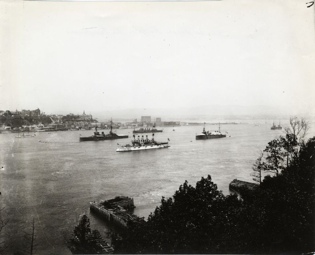 Navires de guerre devant Québec lors du tricentenaire de Québec, 1908, Archives nationales à Québec, Fonds L'Action catholique, (03Q,P428,S3,SS1,D16,P149), Photographe non identifié.