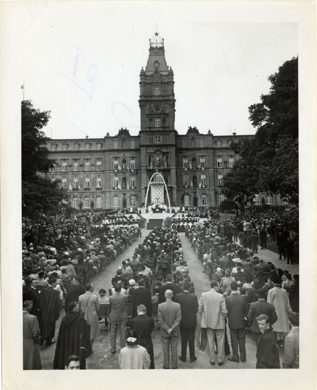 Messe en plein air devant le Parlement de Québec lors du centenaire de l'Université Laval, septembre 1952, Archives nationales à Québec, Fonds L'Action catholique, (03Q,P428,S3,SS1,D16,P150), Photographe non identifié.