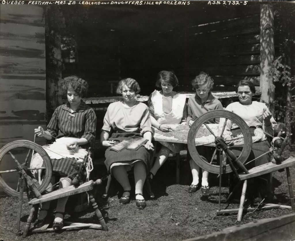 Madame J.-B. Leblond et ses filles au rouet, mai 1928, Archives nationales à Québec, Fonds L'Action catholique, (03Q,P428,S3,SS1,D16,P16), Associated Screen News Limited.