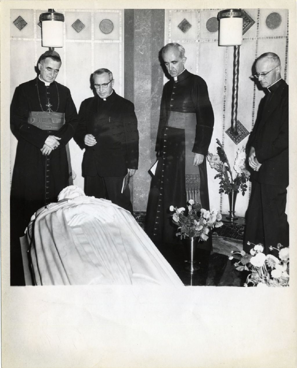 Cardinal Maurice Roy, Mgr Louis-Albert Vachon et l'abbé Honorius Provost au tombeau de Mgr de Laval, septembre 1967, Archives nationales à Québec, Fonds L'Action catholique, (03Q,P428,S3,SS1,D16,P173), Marcel Laforce / Photo l'Action.