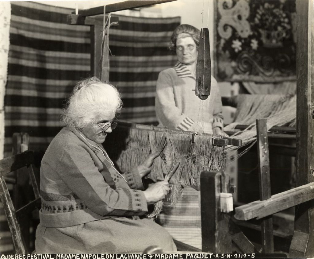 Madame Napoléon Lachance de Saint-Pierre-de-l’Île-d’Orléans et madame Victoria Paquet au métier à tisser, mai 1928, Archives nationales à Québec, Fonds L'Action catholique, (03Q,P428,S3,SS1,D16,P24), Associated Screen News Limited.