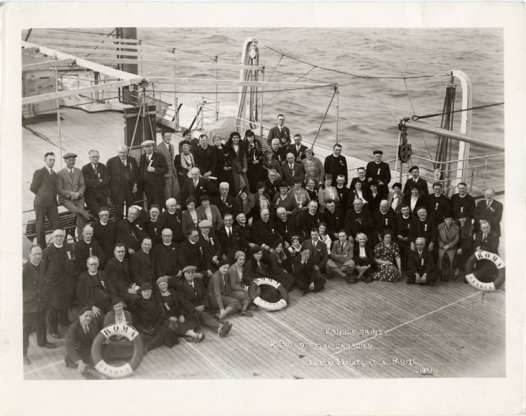Groupe de pèlerins en mer vers Rome, en terre Sainte, 1934, Archives nationales à Québec, Fonds L'Action catholique, (03Q,P428,S3,SS1,D16,P34), Photographe non identifié.