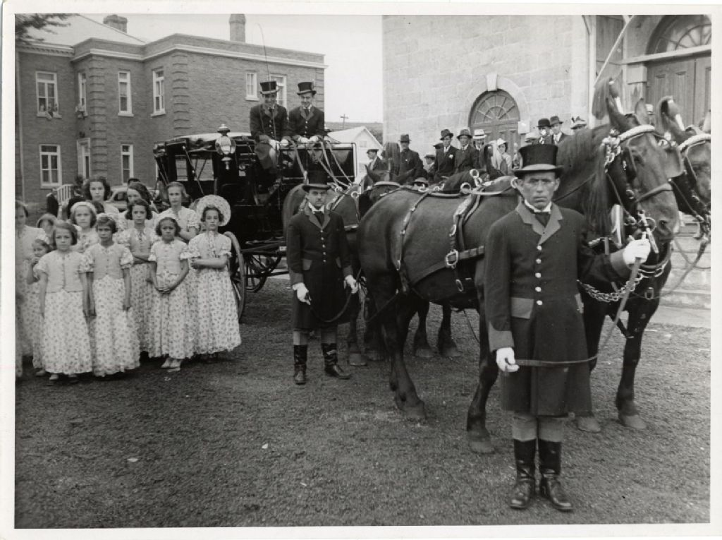 Arrivée du landau du Cardinal Taschereau devant l'église de Saint-Alphonse, 1938, Archives nationales à Québec, Fonds L'Action catholique, (03Q,P428,S3,SS1,D16,P40), C.N. R.