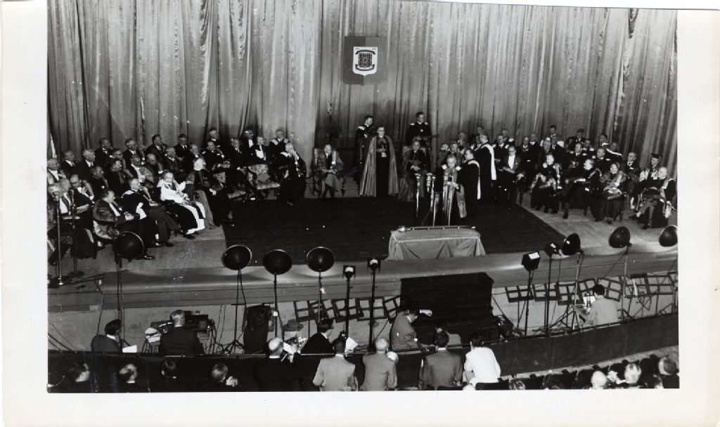 Remise des doctorats honorifiques créés spécialement à l'occasion du centenaire de l'université Laval, septembre 1952, Archives nationales à Québec, Fonds L'Action catholique, (03Q,P428,S3,SS1,D16,P83), [Roger Bédard].