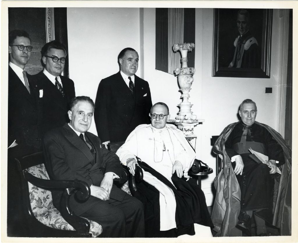 Personnages présents lors de l'ouverture de l'exposition du livre Espagnol pour le centenaire de l'Université Laval, septembre 1952, Archives nationales à Québec, Fonds L'Action catholique, (03Q,P428,S3,SS1,D16,P93), Photographe non identifié.