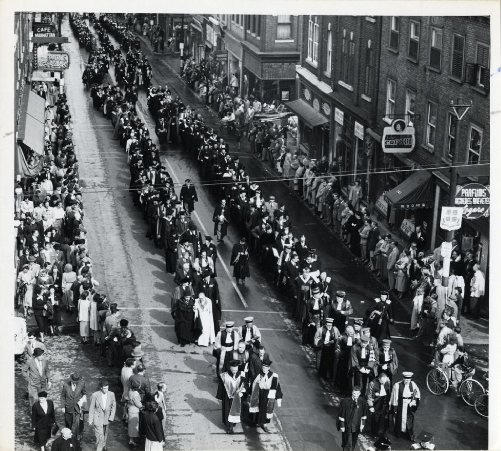Défilé académique pour le centenaire de l'Université Laval, septembre 1952, Archives nationales à Québec, Fonds L'Action catholique, (03Q,P428,S3,SS1,D16,P95), [Roger Bédard].