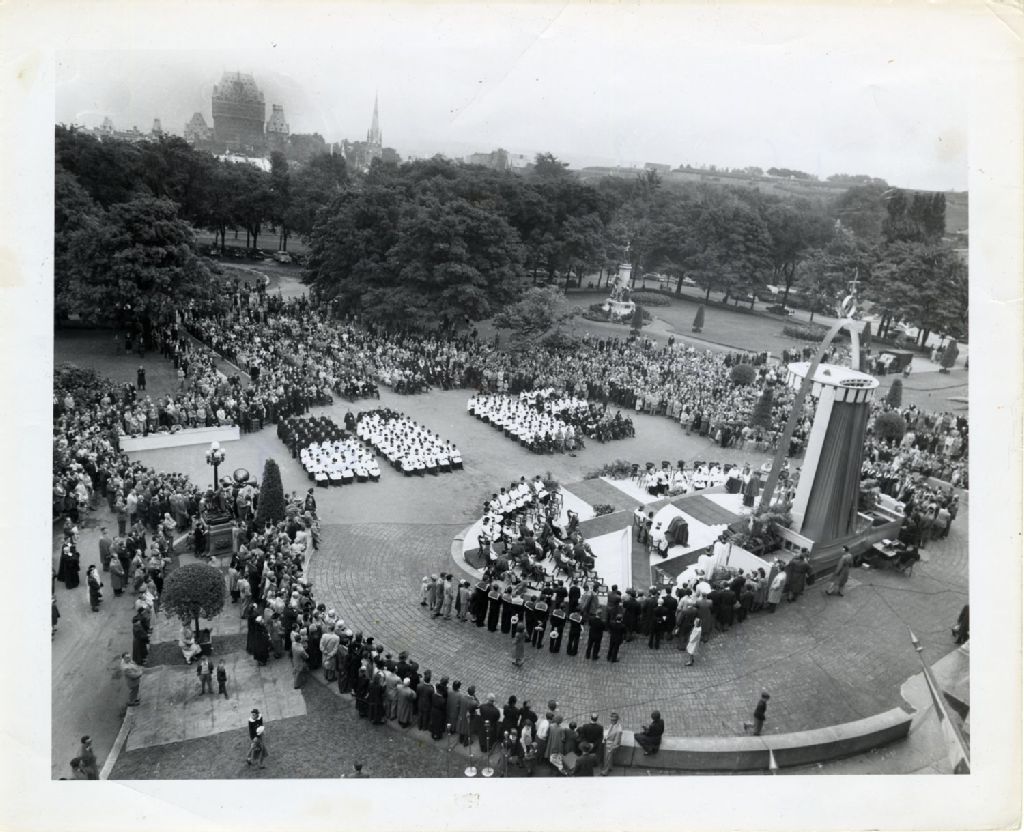Messe en plein air devant le Parlement de Québec lors du centenaire de l'université Laval, septembre 1952, Archives nationales à Québec, Fonds L'Action catholique, (03Q,P428,S3,SS1,D16,P97), Photographe non identifié.