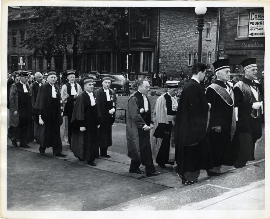 Arrivée des gens sur le parvis de l'église Saint-Roch pour la messe pontificale lors du centenaire de l'Université Laval