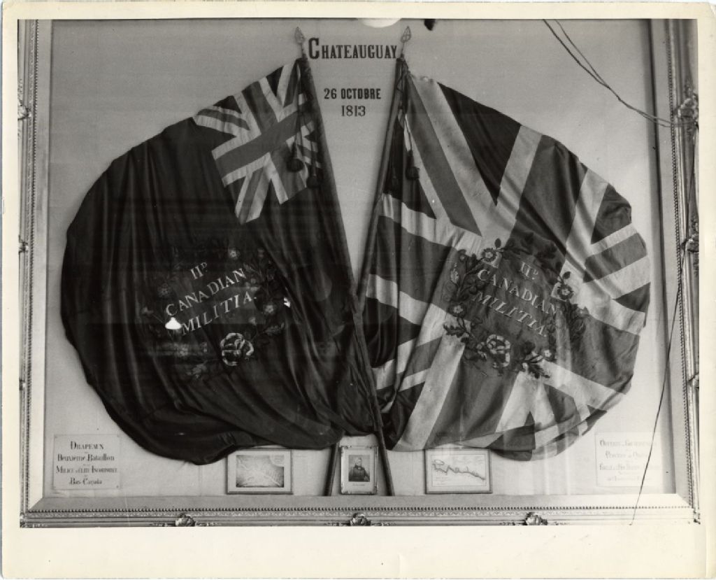 Montage de drapeaux du Deuxième Bataillon de la Milice d'élite Incorporée du Bas-Canada, [Vers 1965], Archives nationales à Québec, Fonds L'Action catholique, (03Q,P428,S3,SS1,D17,P36), Photographe non identifié.