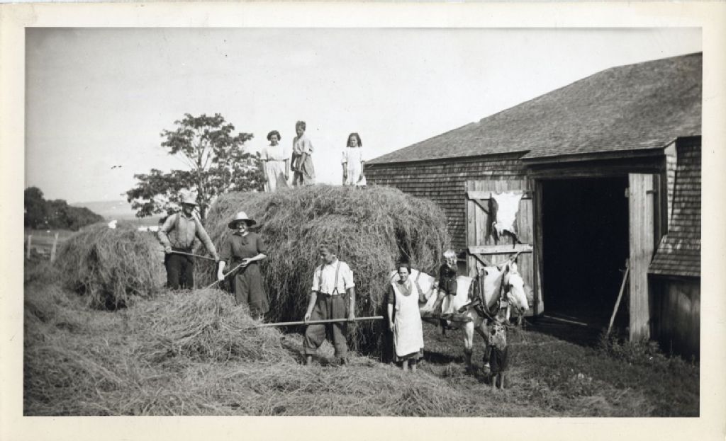 Famille d'Alice Lagacé aux foins, [Vers 1930], Archives nationales à Québec, Fonds L'Action catholique, (03Q,P428,S3,SS1,D18,P17), Photographe non identifié.