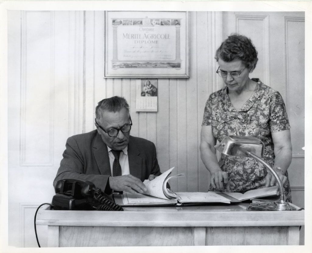Madame Edgar Larose s'entretient avec l'agronome Irénée Paré, 1960, Archives nationales à Québec, Fonds L'Action catholique, (03Q,P428,S3,SS1,D18,P37), Photographe non identifié.