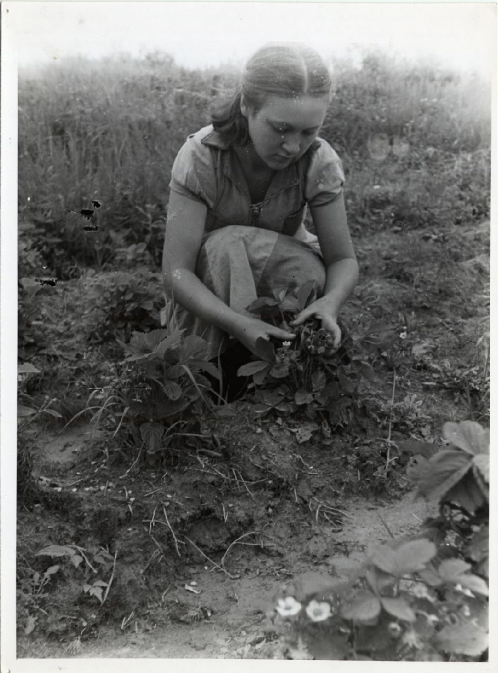 Madame Armand Huot dans son champ de fraises, [Vers 1930], Archives nationales à Québec, Fonds L'Action catholique, (03Q,P428,S3,SS1,D18,P53), C. N. R.