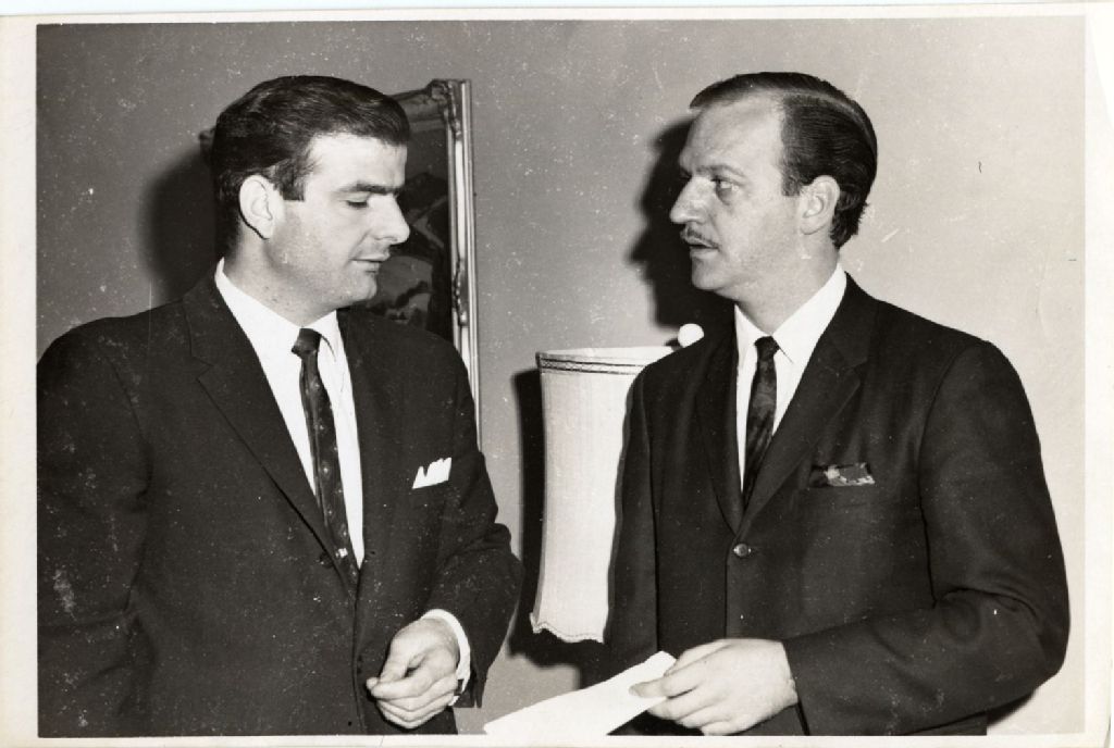 Arthur Vachon et Robert G. Burns, avril 1966, Archives nationales à Québec, Fonds L'Action catholique, (03Q,P428,S3,SS1,D20,P4), Photographe non identifié.