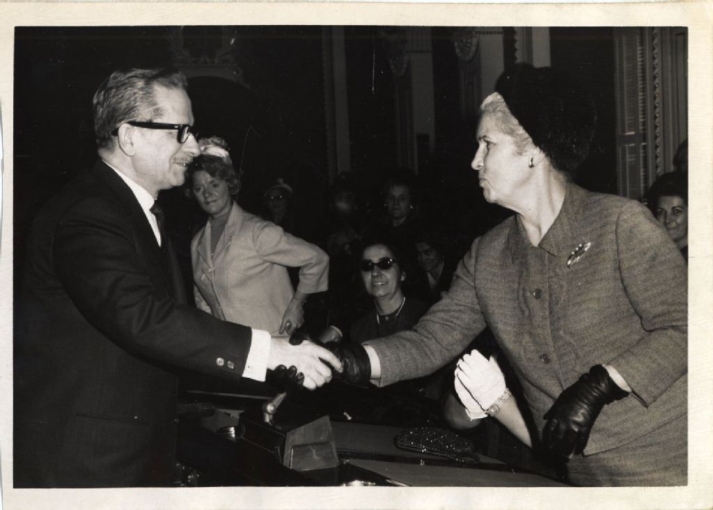 Lorette Martel, madame Paul Sauvé et Daniel Johnson, février 1967, Archives nationales à Québec, Fonds L'Action catholique, (03Q,P428,S3,SS1,D20,P42), Photographe non identifié.