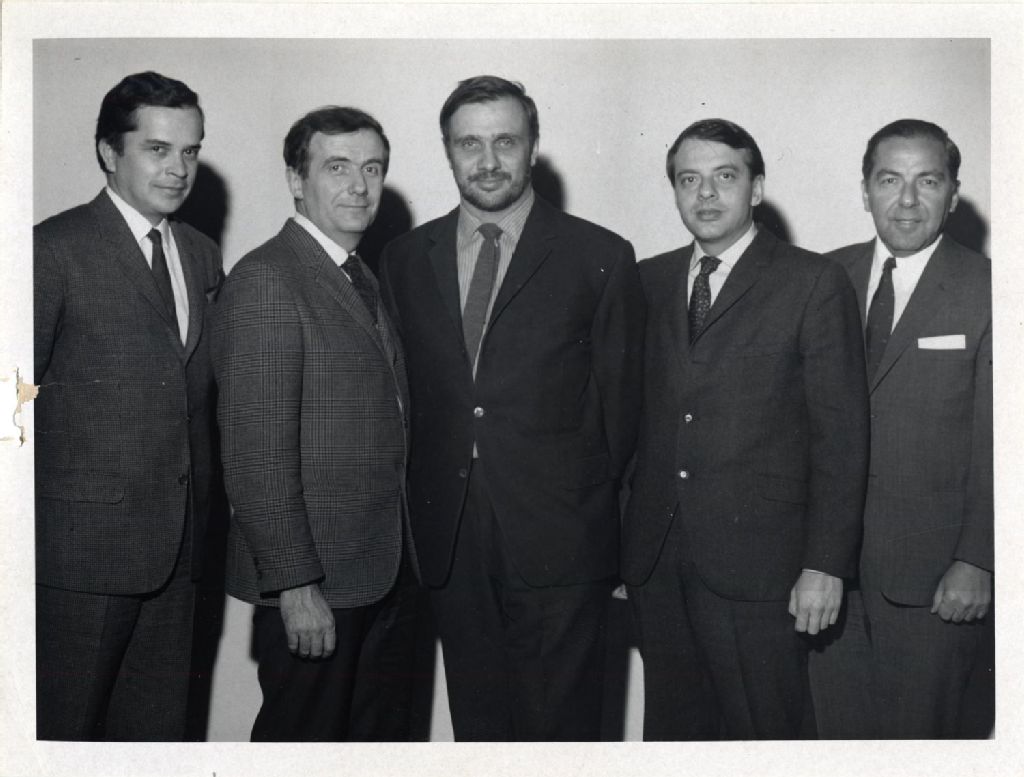 Jacques Collins, Arthur Lamothe, Jean Dansereau, Guy Fournier et David Bier, [Vers 1965], Archives nationales à Québec, Fonds L'Action catholique, (03Q,P428,S3,SS1,D21,P7), David Bier studios.