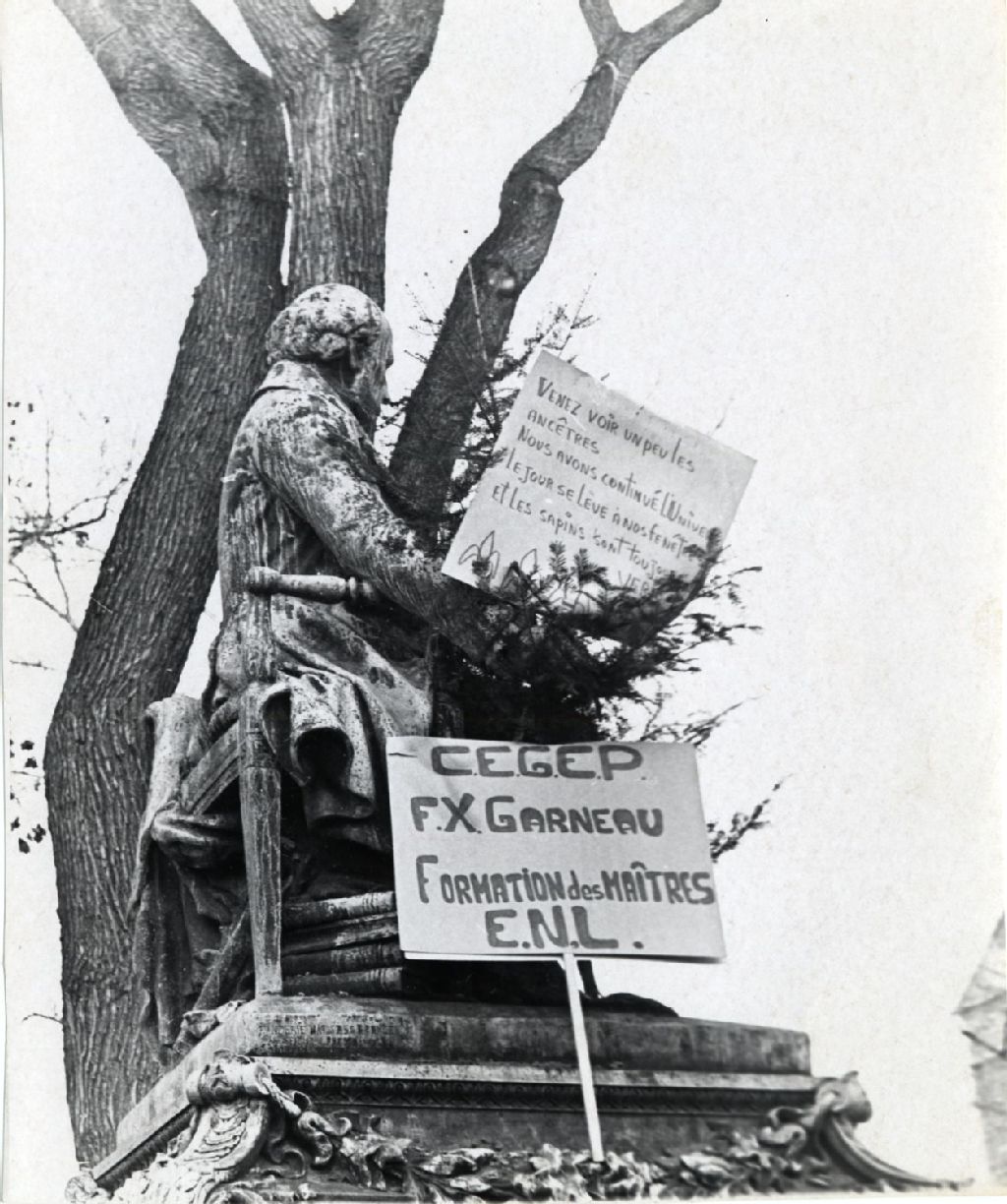 Manifestation, Grande Allée Est dans le quartier Saint-Jean-Baptiste, décoré par des affiches "C.E.G.E.P - F.X. Garneau - Formation des maîtres - E.N.L.", "Venez voir un peu les ancêtres, Nous avons continué l'Univers, Le jour se lève à nos fenêtres et les sapins sont toujours verts." et un sapin