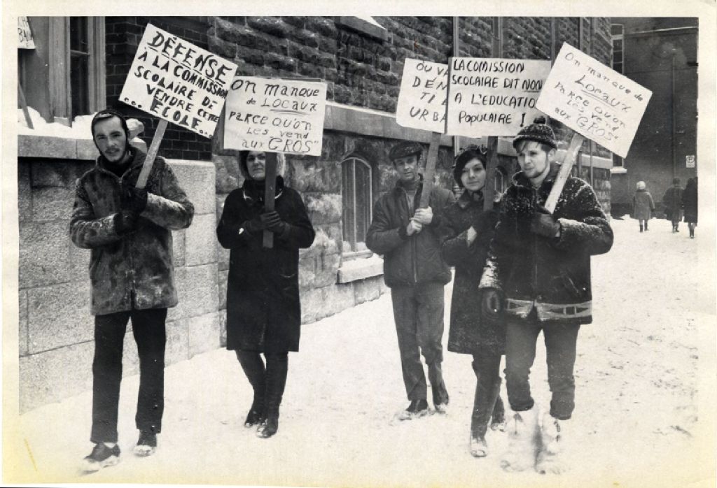 Pancartes "Défense à la commission scolaire de vendre cette École", "On manque de locaux parce qu'on les vend aux GROS">, "La commission dit non à l'éducation populaire!", etc