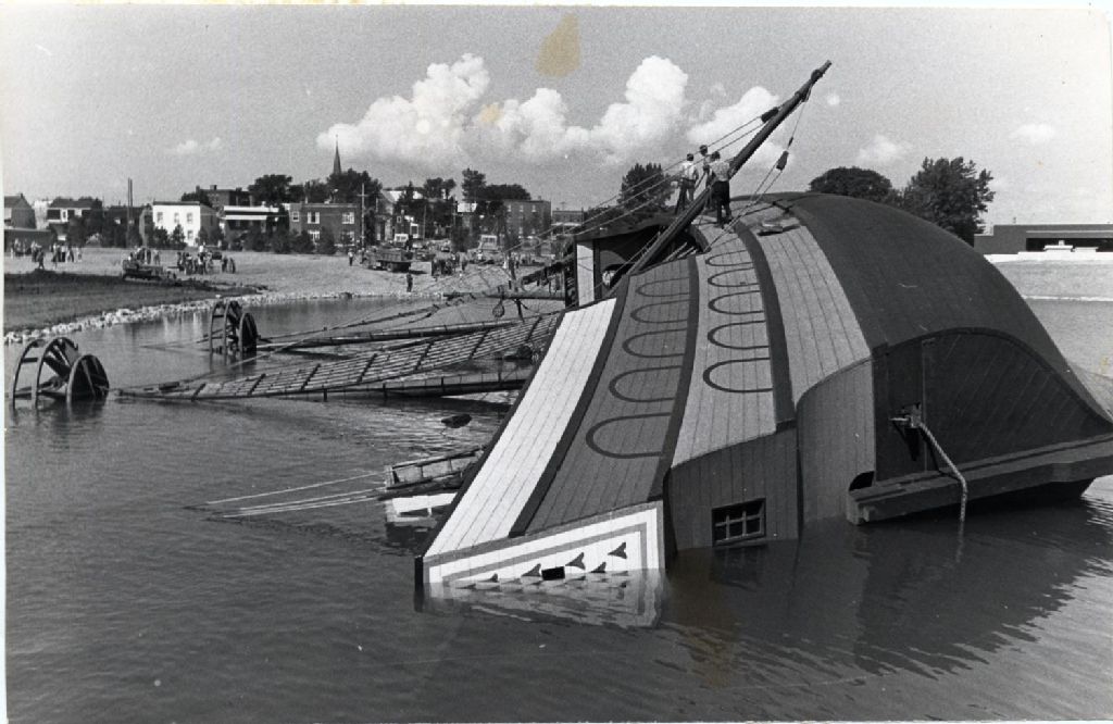 Réplique du navire la "Grande Hermine" renversée dans le bassin, [Vers 1970], Archives nationales à Québec, Fonds L'Action catholique, (03Q,P428,S3,SS1,D28,P13-5), Jacques Du Fresne.