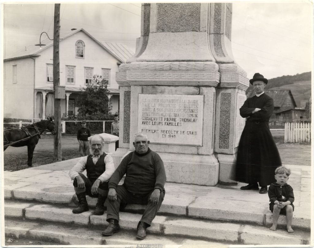 Un prêtre, deux hommes et un enfant au pied du socle du monument aux "21", [Vers 1925], Archives nationales à Québec, Fonds L'Action catholique, (03Q,P428,S3,SS1,D28,P42), C. N. R.
