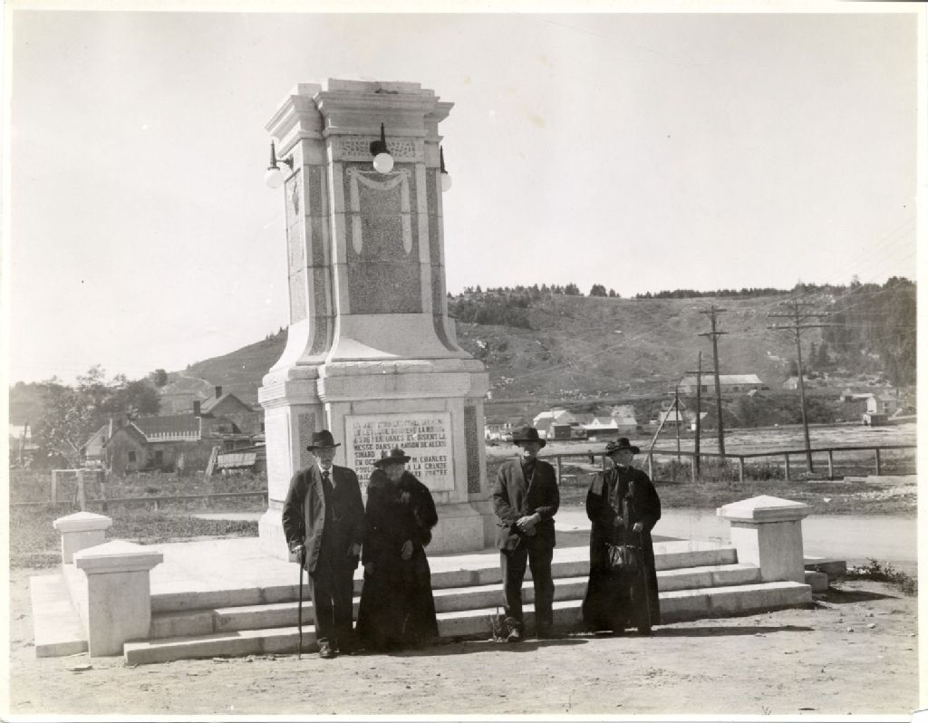 Quatre personnes au pied du socle du monument des "21", [Vers 1925], Archives nationales à Québec, Fonds L'Action catholique, (03Q,P428,S3,SS1,D28,P43), C. N. R.