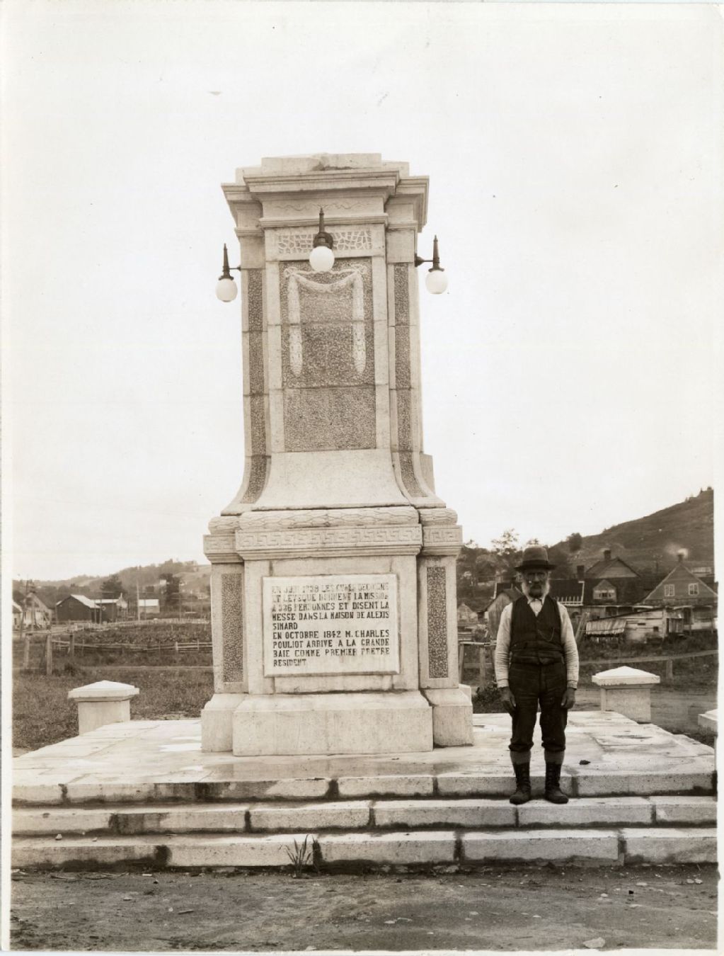 Un homme au pied du socle du monument des "21", [Vers 1925], Archives nationales à Québec, Fonds L'Action catholique, (03Q,P428,S3,SS1,D28,P44), Chemin de fer national du Canada.