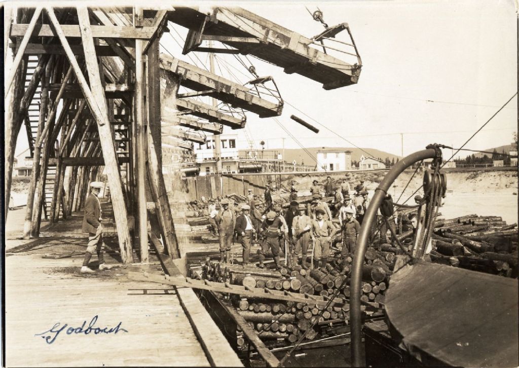 Vue prise sur le quai lors du chargement d'un bateau de bois de pâte à Godbout