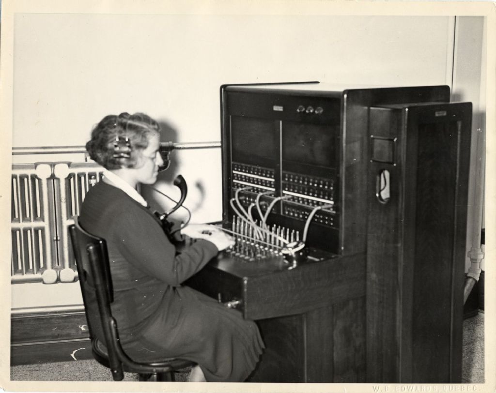 Mlle Labadie la téléphoniste à son poste de travail, [Vers 1935], Archives nationales à Québec, Fonds L'Action catholique, (03Q,P428,S3,SS1,D2,P54), W. B. Edwards.
