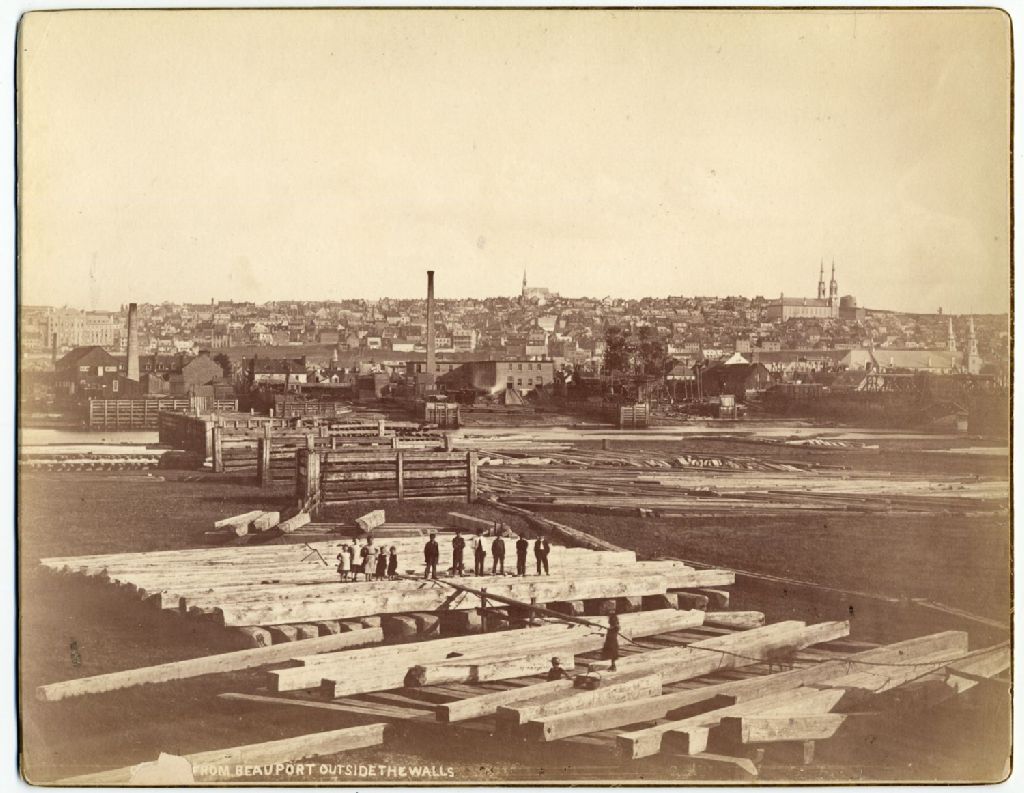 Vue prise des battures de la rivière Saint-Charles et des chantiers maritimes, [Vers 1880], Archives nationales à Québec, Fonds L'Action catholique, (03Q,P428,S3,SS1,D30,P10-5), [L. P. Vallée].