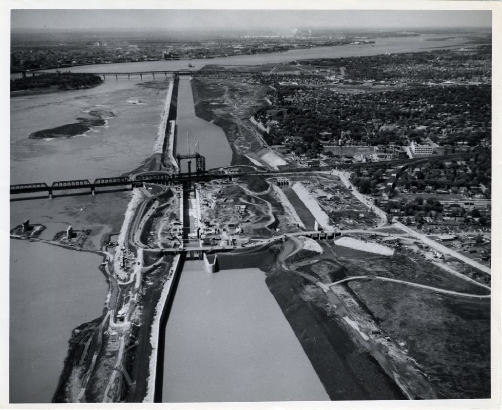 Vue aérienne de la voie maritime du Saint-Laurent en face de Montréal, juin 1958, Archives nationales à Québec, Fonds L'Action catholique, (03Q,P428,S3,SS1,D30,P157), Hans van der AA.