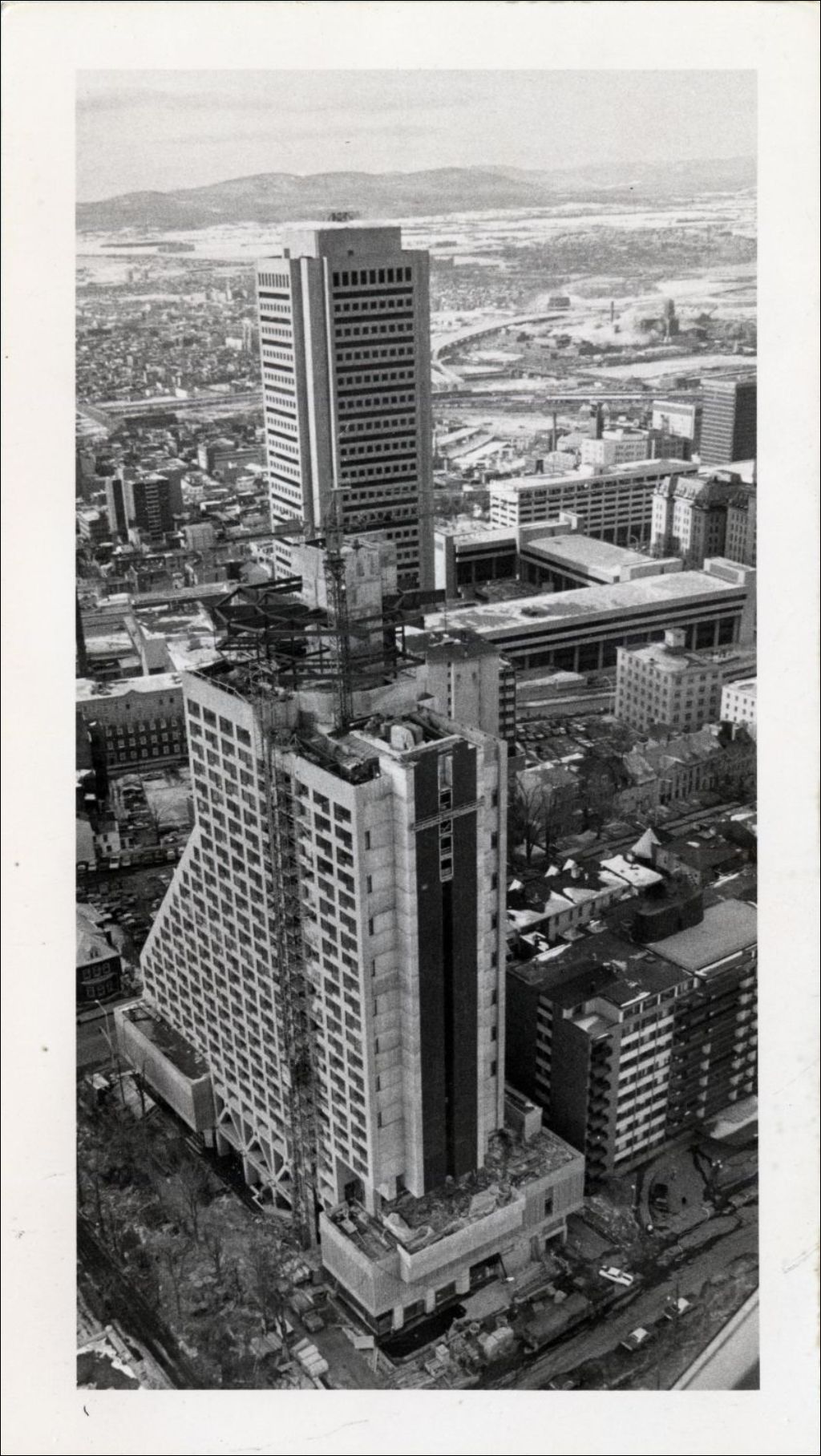 Vue du chantier de construction de l'hôtel "Le Concorde" jusqu'à la rivière Saint-Charles, [Vers 1975], Archives nationales à Québec, Fonds L'Action catholique, (03Q,P428,S3,SS1,D30,P9-1), Photographe non identifié.