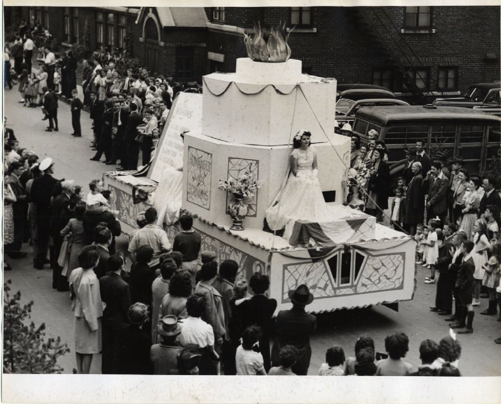 Char allégorique "Hommages à nos écrivains", [Vers 1950], Archives nationales à Québec, Fonds L'Action catholique, (03Q,P428,S3,SS1,D36,P12), Photographe non identifié.