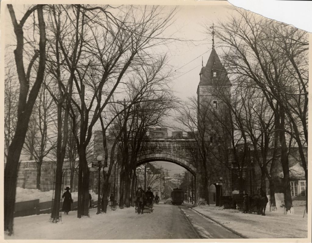 Porte Saint-Louis sur la rue Saint-Louis en hiver, [Vers 1930], Archives nationales à Québec, Fonds L'Action catholique, (03Q,P428,S3,SS1,D39,P14-12), Pacifique Canadien.