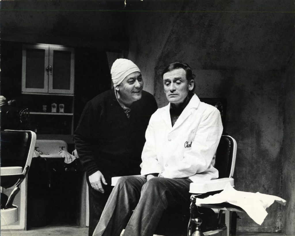 Représentation sur la scène du Théâtre Port-Royal de "L'Escalier" de Charles Dyer, [Vers 1965], Archives nationales à Québec, Fonds L'Action catholique, (03Q,P428,S3,SS1,D40,P15), André Le Coz.