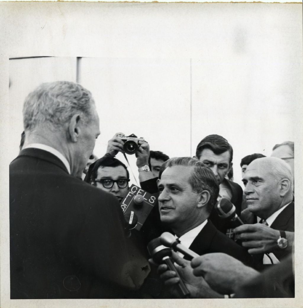 Maurice Couve de Murville et Jean-Jacques Bertrand, [Vers 1965], Archives nationales à Québec, Fonds L'Action catholique, (03Q,P428,S3,SS1,D44,P490), Photographe non identifié.