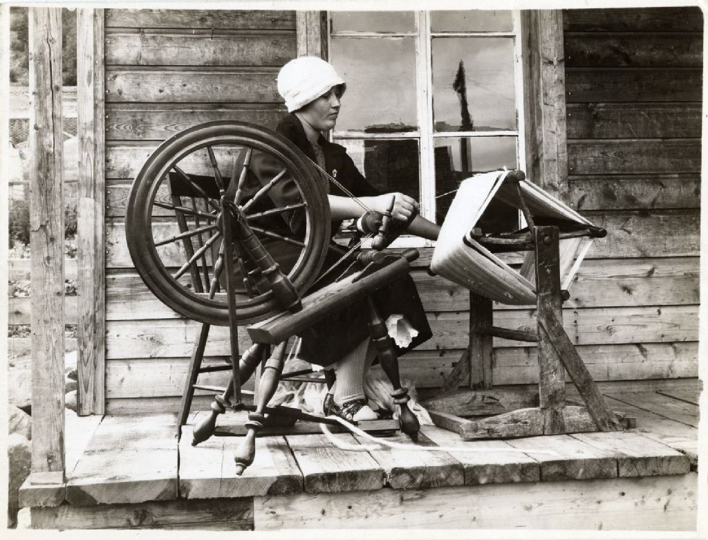 Artisane, fileuse, à l'oeuvre sur sa galerie avec son rouet