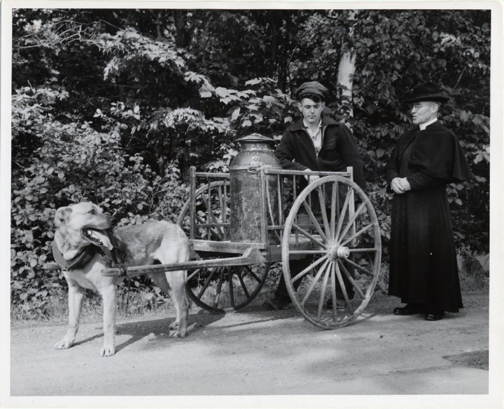Transport de lait dans un chariot tiré par un chien, [Vers 1930], Archives nationales à Québec, Fonds L'Action catholique, (03Q,P428,S3,SS1,D5,P14), Miller Services Ltd, Toronto.